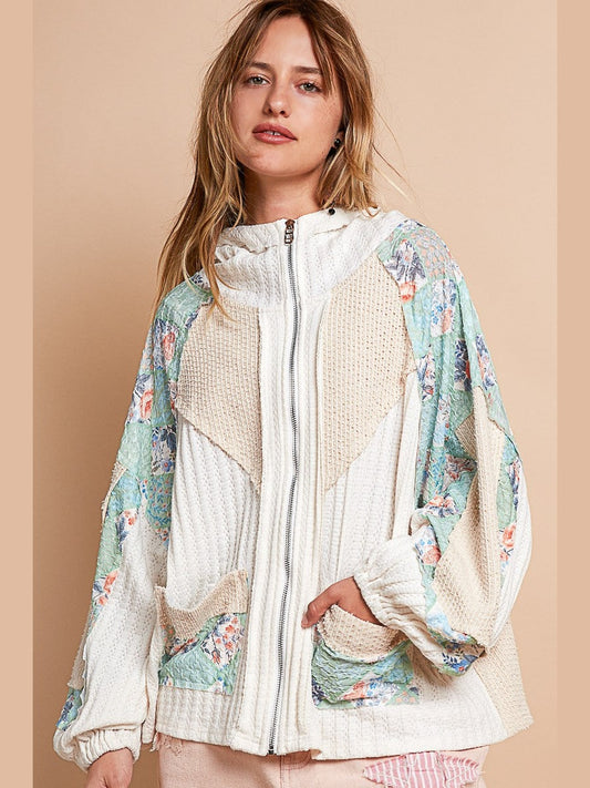 Jacket Denim Patch work Textured Knit Printed contrast zipper GKT321