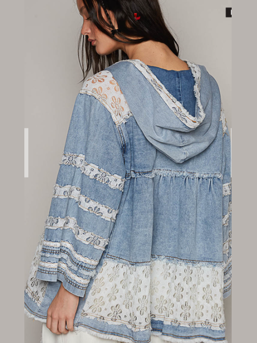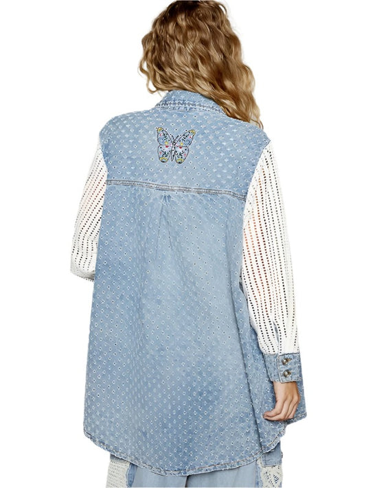 Jacket Denim Vintage Washed Crochet Sleeve Embroidery UWT307