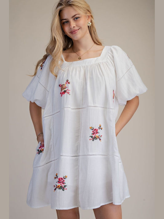 Dress Pullover White Embroidered Floral Bubble Sleeve 2 Pocket Women's ED28548