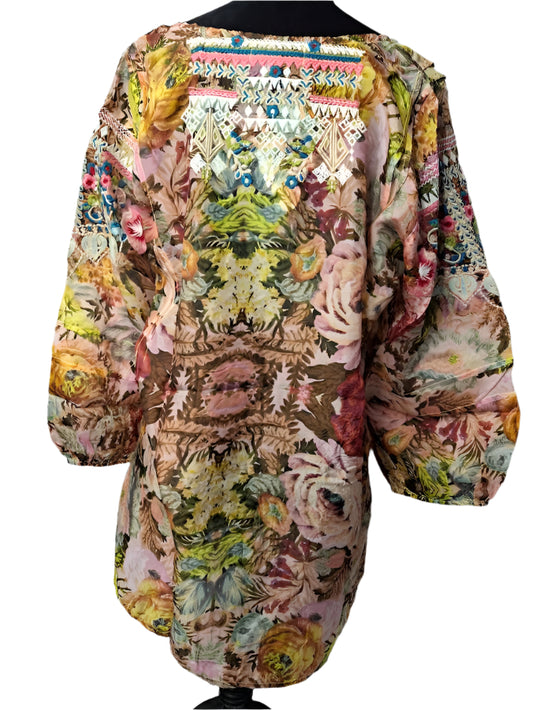 Shirt Pull Over Long Sleeve Sheer Multi Colored Floral Olive AAh5556