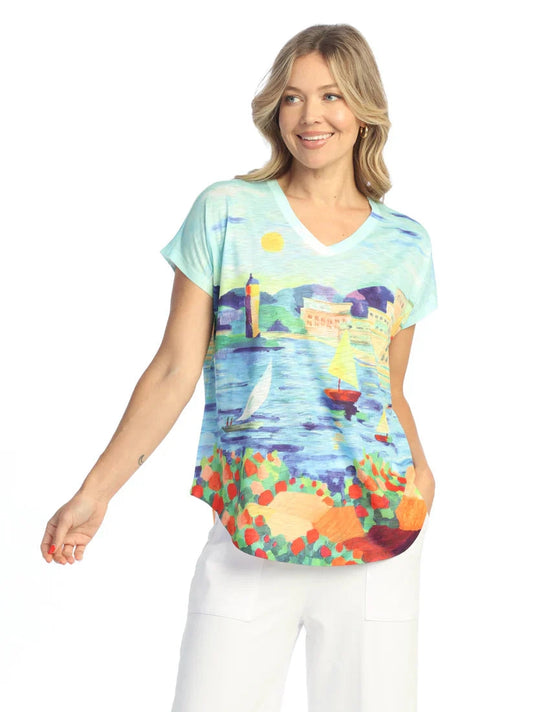 60-2057 Riviera Multi Color River Scene Short Sleeve V Neck Women's Top