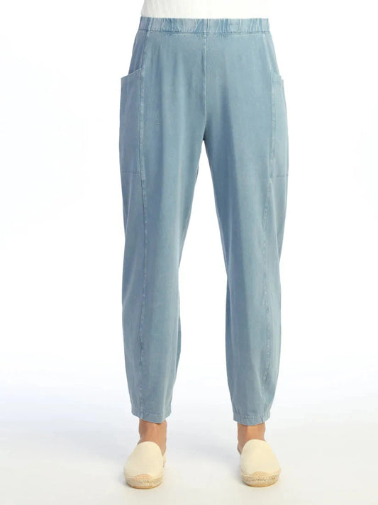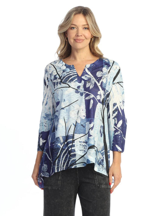 M126-2087 Indigo Paris Imprint Cotton Top With Linen Handkerchief Hem 3/4 Sleeve