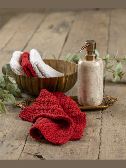 Pot Holder Red/Cream Knit With Leather Hanger 8x8"N249102