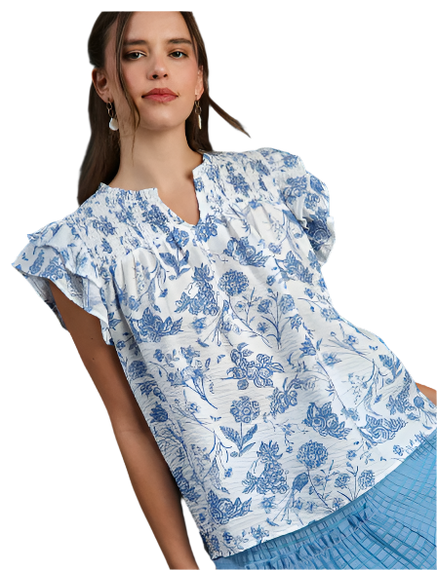 Two Tone Boxy Cut Blue Floral Print Smocked Details & Ruffle Sleeve K8471
