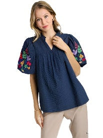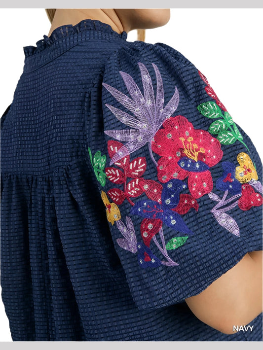 Blouse Navy Blue Embroidered Puff Sleeve k7810