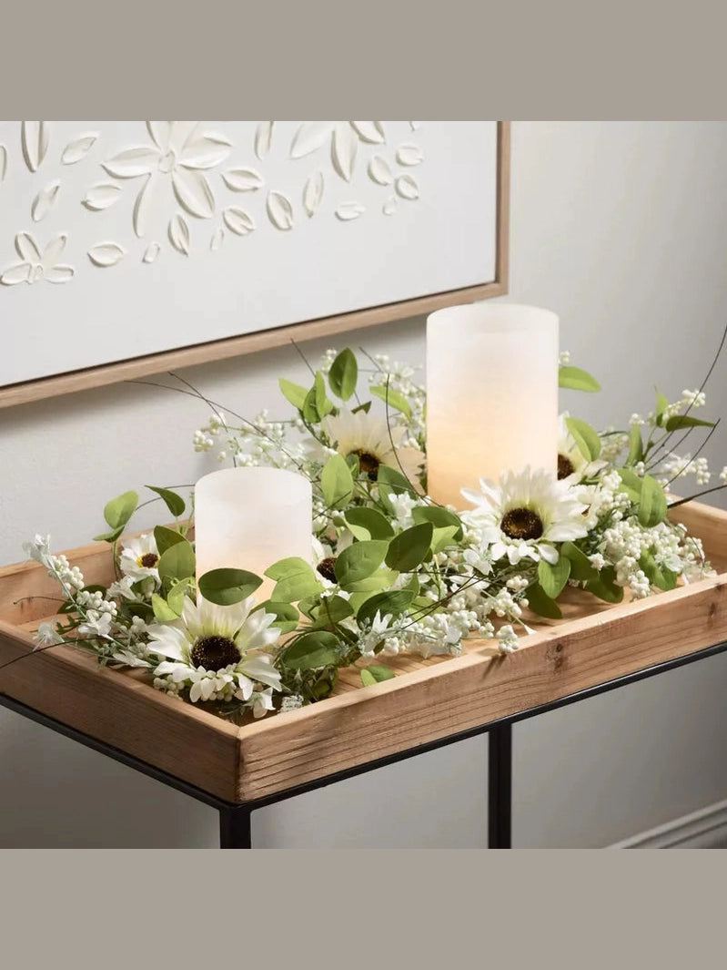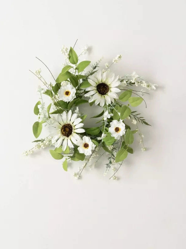 Sullivans Sunflower/Wispy Berry Ring - This beautiful artificial candle ring combines lifelike white sunflowers with wispy berries, adding a fresh and vibrant touch to your decor. Perfect for boho or farmhouse-inspired interiors.