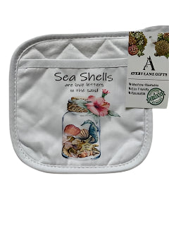 "Add some love to your kitchen with our sea shell inspired pot holder and oven mitt! These unique pieces feature adorable shells. Perfect for beach lovers and anyone looking to add a touch of whimsy to their cooking routine."