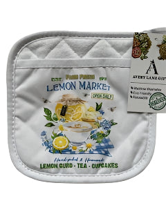 Protect yourself (and your kitchen) with a playful twist! The AVERY LANE-POT HOLDER/OVEN MITT-COLLECTION - LEMON MARKET features a bright blue and sunny yellow design, complete with charming lemons. This pot holder/oven mitt combo adds a pop of color and a touch of whimsy to your cooking routine.