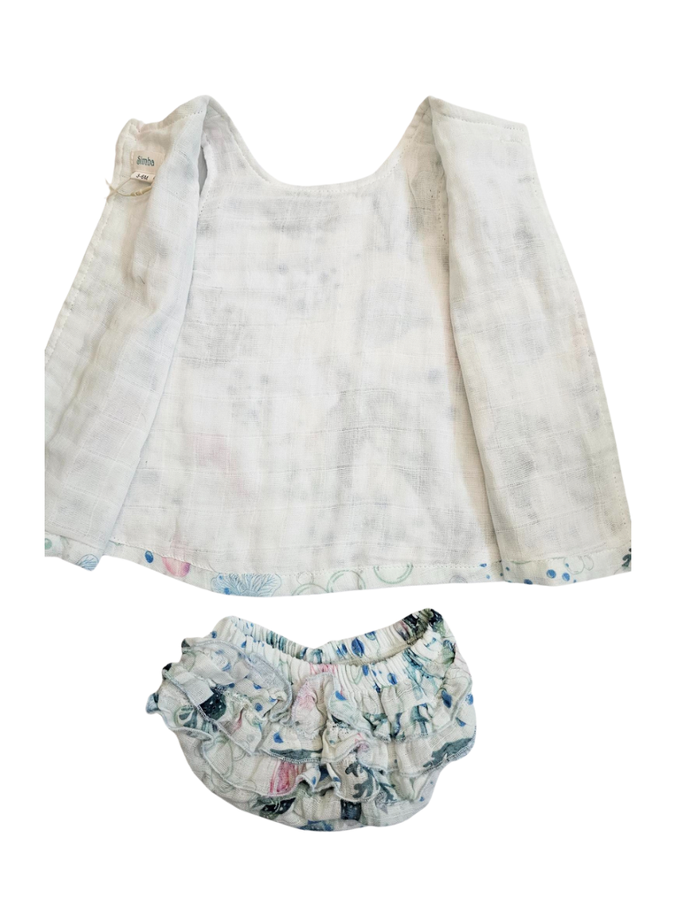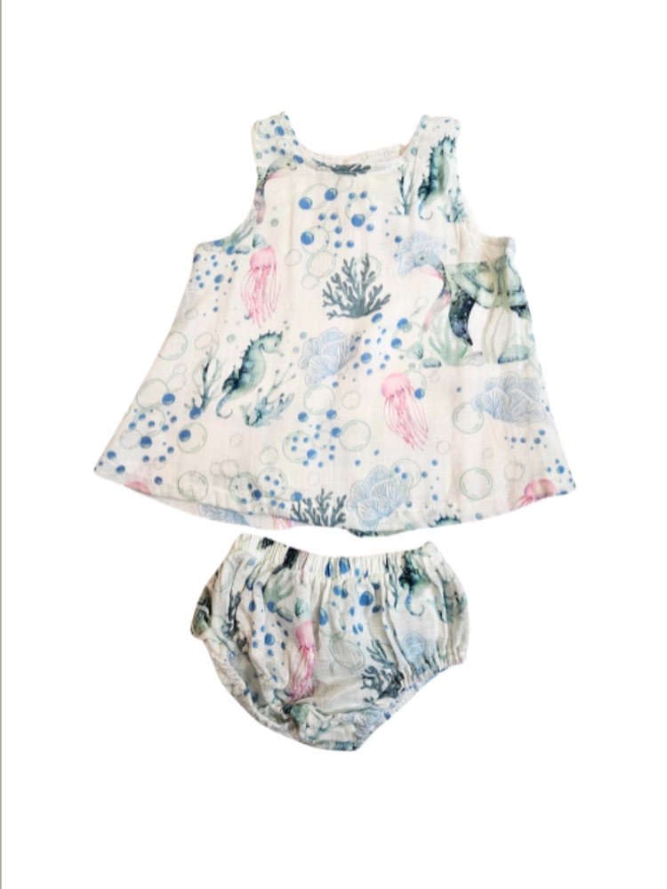 This 100% cotton/gauze baby dress features a charming open back and comes with a matching set of bloomers. Made with comfort in mind, this dress will keep your little one cool and stylish. Perfect for any occasion, especially when paired with an adorable designs.