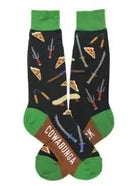 Get ready to slice up some style with these Pizza /Knife socks for men! The perfect blend of black and green, these socks will add a tasty twist to any outfit. With a playful design and comfortable fit, you'll be the slickest dresser in town. (No actual pizza or knives included, sorry!)