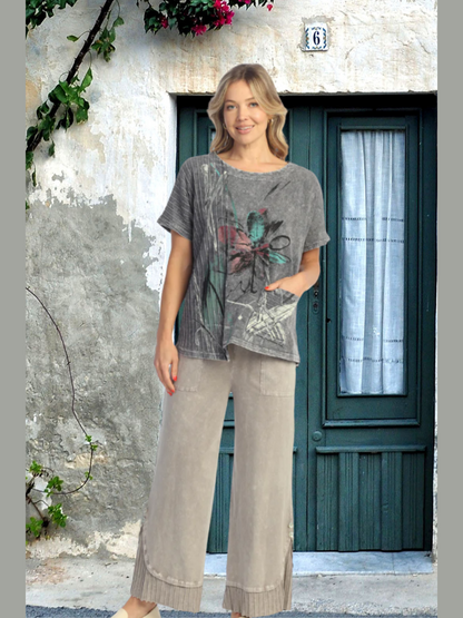 Jess & Jane M124-2046 Field Notes Grey Floral 1 Pocket Short Sleeve Women's Top