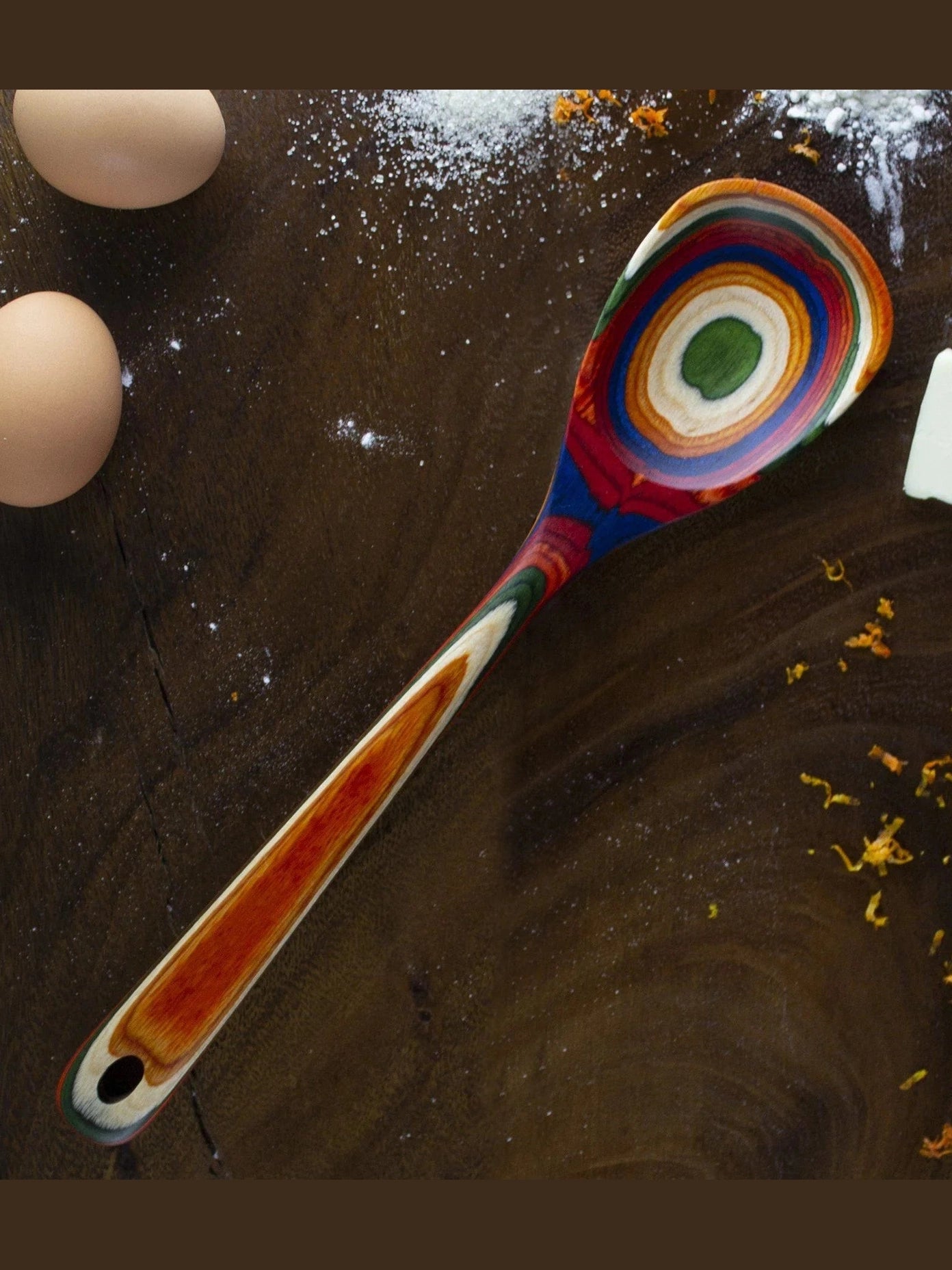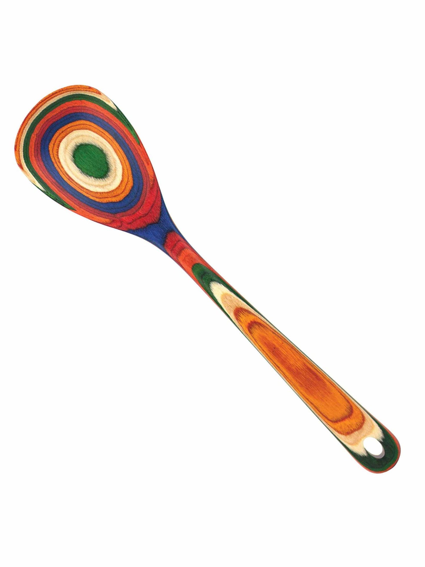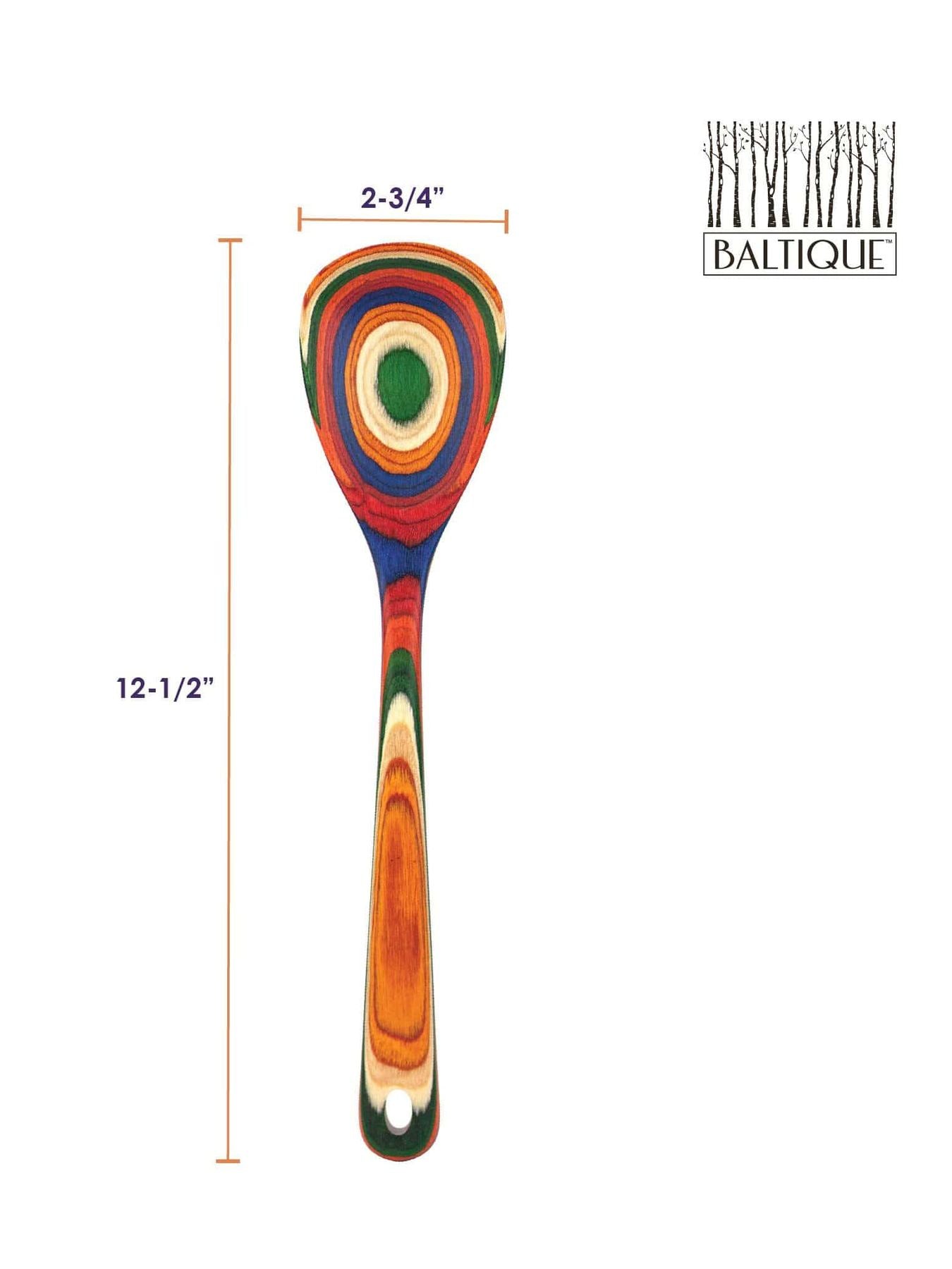 Add a splash of warming color to your kitchen with the Baltique® Marrakesh Collection Mixing Spoon. This eye-catching utensil is masterfully crafted from layers of colored birched wood to create a gorgeous color array. The Marrakesh Collection features a rainbow blend of red, green, orange, blue and natural wood colors. The colorway was inspired by the bright and colorful marketplaces of Morocco. This brightly colored mixing spoon is wonderful for stirring and a delightful choice for serving that's sure to draw attention from guests. At 12-1/2 inches long it can reach even the deepest of cooking pots and is safe for use on nonstick coatings! Includes a convenient hanging hole for easy storage and display. To clean, hand wash or wipe with a damp cloth; do not soak or wash in the dishwasher. Pair the mixing spoon with the other utensils in the Marrakesh Collection for a bright bouquet of color in your kitchen!