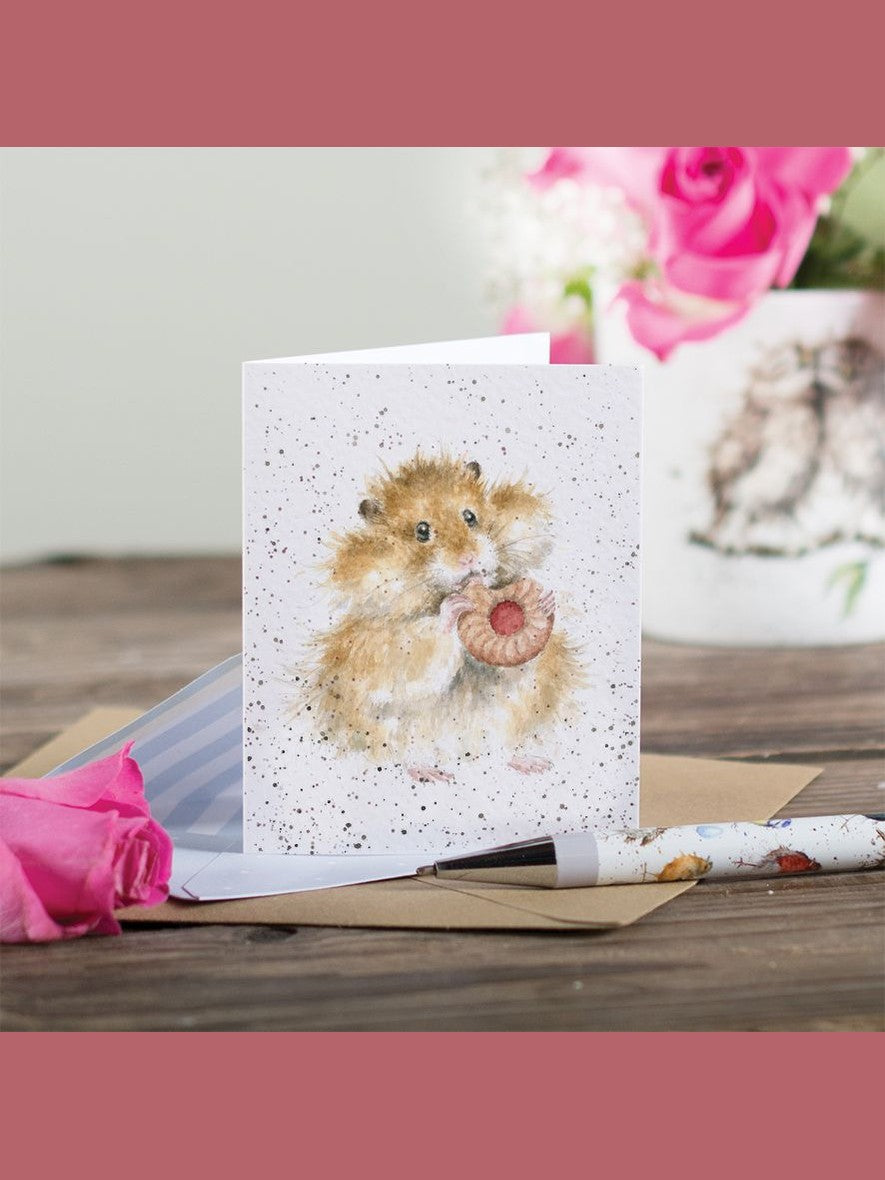 Starring an adorable hamster eating a biscuit this gift enclosure card will make a big impact when accompanying a gift or sending a little message. Measuring a small 3.58 x 2.83 inches this cute card is supplied with an illustrated color envelope and is printed on our signature sustainably sourced textured board.